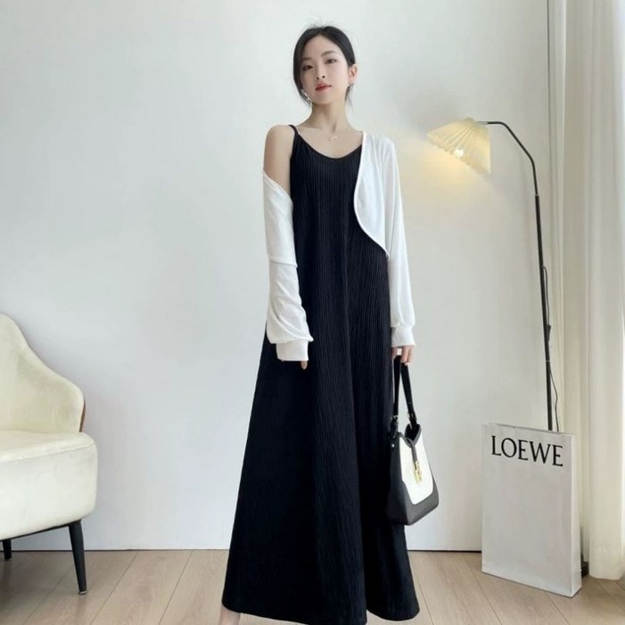 여성 나시 롱 원피스 플리츠 루즈핏 민소매 무지 끈나시 원피스 N0040