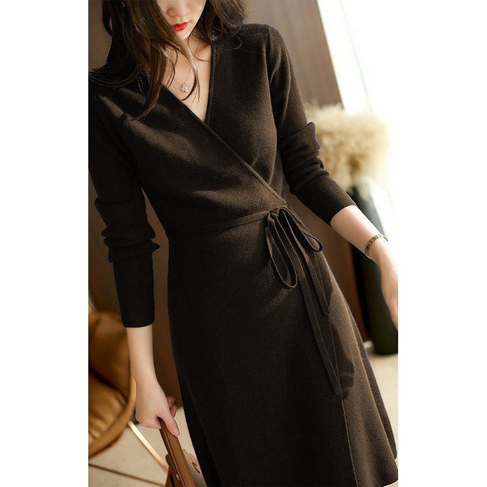 POMTOR 여성 고급스러운 빈티지 빅사이즈 허리끈 언발 니트 미디 원피스