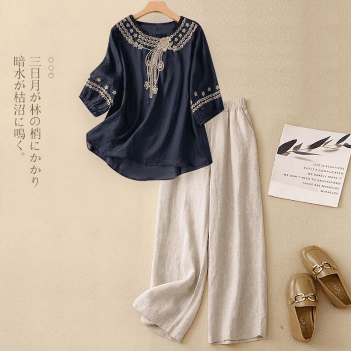 ANYOU 여성 여름 편안한 루즈핏 슬랙스 상하복 면마 캐주얼 투피스 세트
